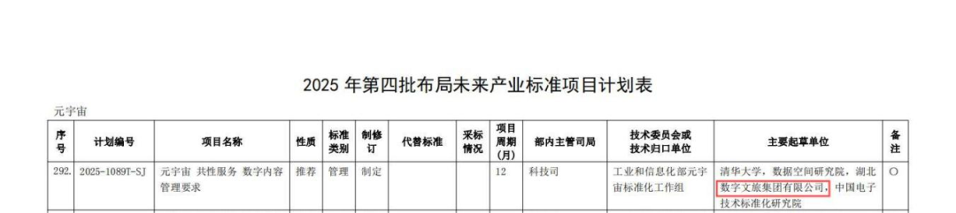 數(shù)旅集團(tuán)標(biāo)準(zhǔn)建設(shè)取得新成果——參編行業(yè)標(biāo)準(zhǔn)入選工信部計(jì)劃。近日,數(shù)旅集團(tuán)參編的《元宇宙共性服務(wù)數(shù)字內(nèi)容管理要求》成功入選工業(yè)和信息化部2025年第四批行業(yè)標(biāo)準(zhǔn)制修訂計(jì)劃——布局未來產(chǎn)業(yè)標(biāo)準(zhǔn)項(xiàng)目計(jì)劃。此次入選,標(biāo)志著數(shù)旅集團(tuán)在元宇宙標(biāo)準(zhǔn)化建設(shè)方面取得新進(jìn)展,也為推動(dòng)構(gòu)建可信、有序的元宇宙生態(tài)提供重要參考。未來,數(shù)旅集團(tuán)將持續(xù)深化國有企業(yè)改革,充分發(fā)揮“科改企業(yè)”創(chuàng)新主體作用,通過“標(biāo)準(zhǔn)引領(lǐng)、創(chuàng)新驅(qū)動(dòng)”的發(fā)展路徑,不斷完善標(biāo)準(zhǔn)化工作體系,為文旅產(chǎn)業(yè)高質(zhì)量發(fā)展提供堅(jiān)實(shí)支撐。